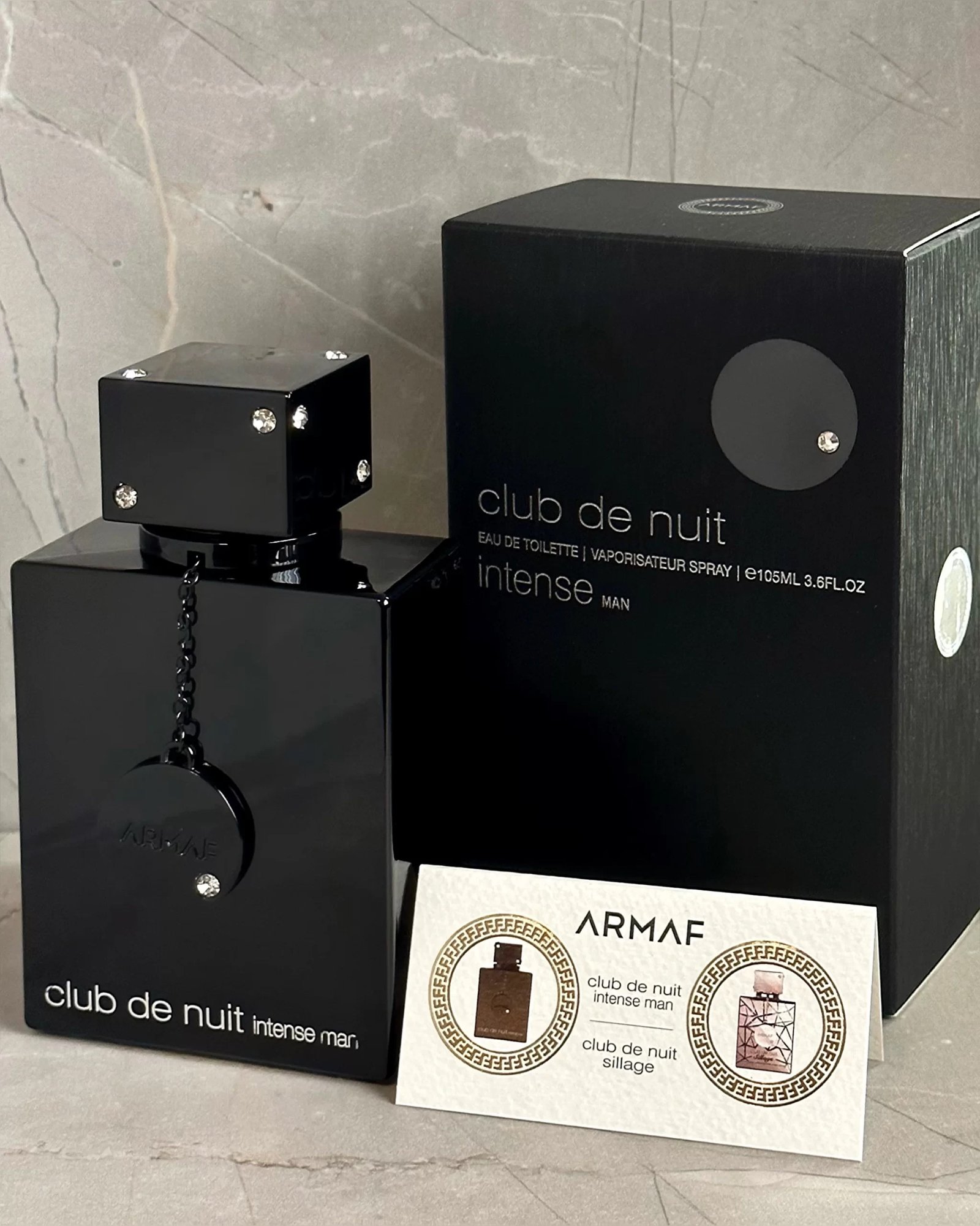 Presentación: El frasco, de color negro, tiene incrustaciones que simulan diamantes, una placa con el logo de Armaf y una cadena colgante.